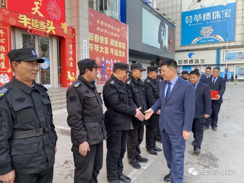 春节前夕,东营市顺达保安服务有限责任公司董事长董新兵同志与班子领导分头走访慰问坚守工作岗位的一线员工,向他们致以节日的问候,送去了顺达保安公司领导们的亲切关怀和新春祝福。 董总及公司领导分别与坚守岗位的员工们一一握手,并与他们亲切交谈,对他们春节期间放弃回家过年,坚守工作岗位表示感谢,希望他们不辜负公司领导和客户单位的信任,继续发扬不怕苦不怕累的精神,做好春节期间的值班备勤和疫情防控工作,为客户单位提供一流的保安服务。并祝他们及家人新年快乐!幸福安康! END 携手顺达保安 天天幸福平安